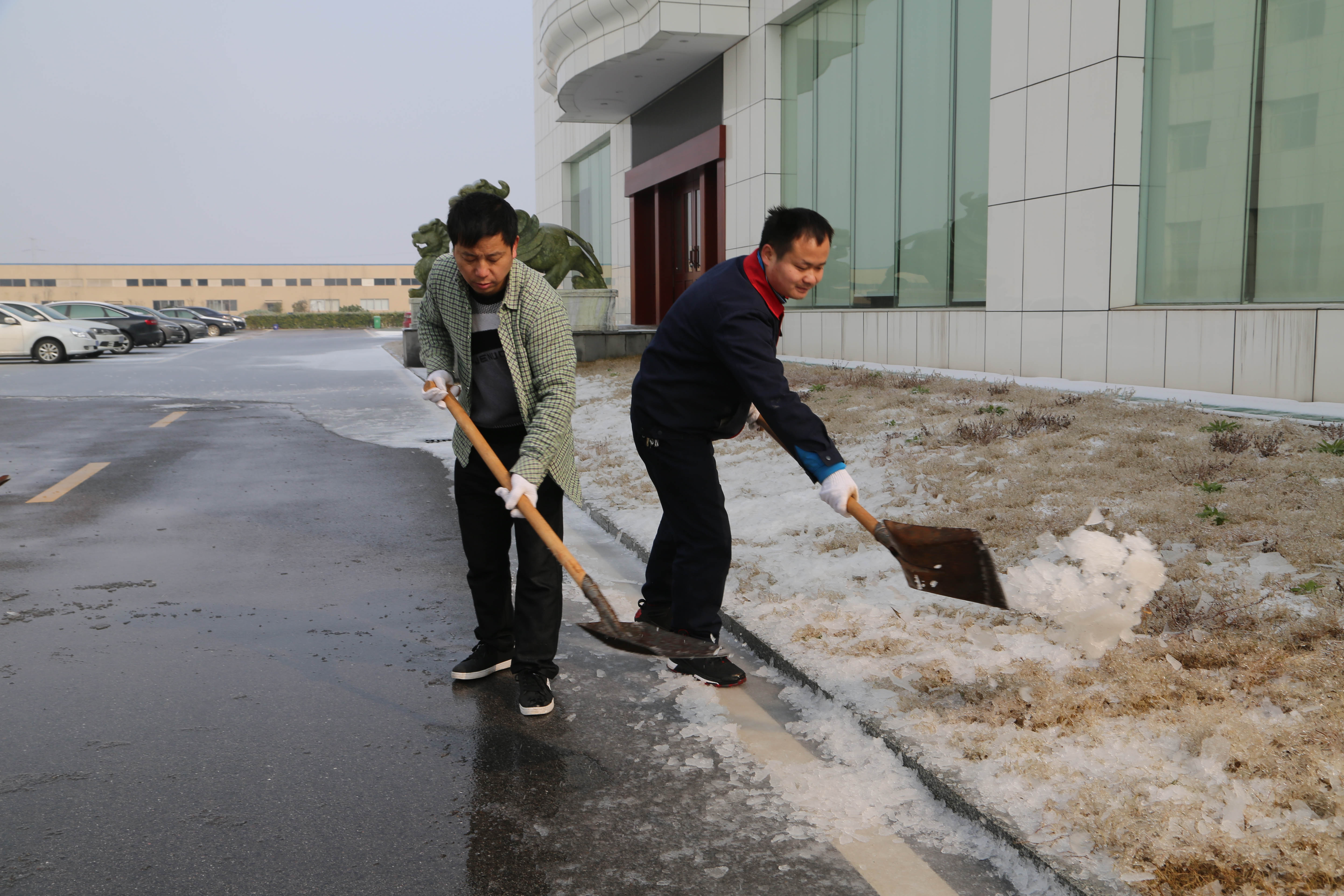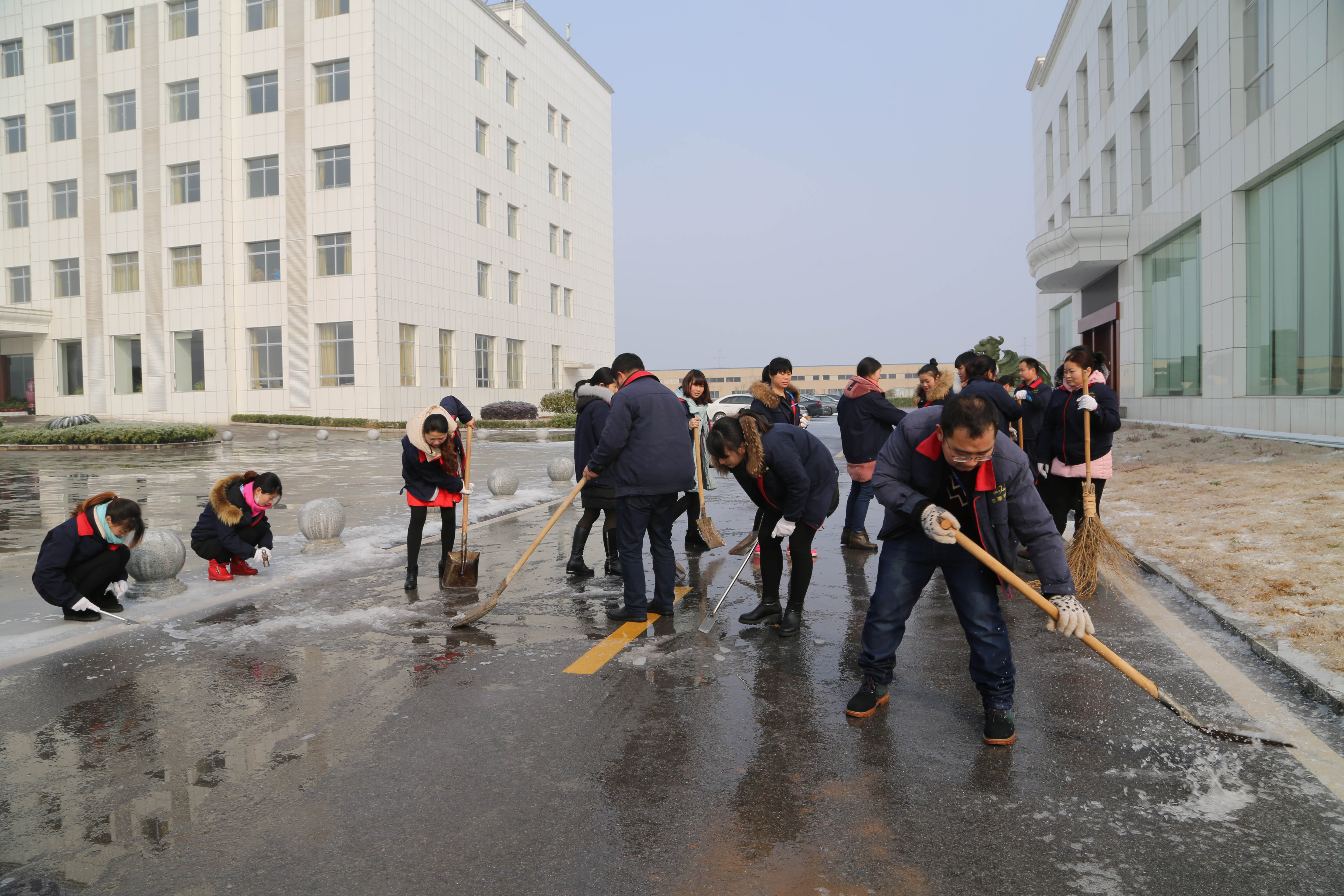早上上班的時候,看到同事們特別艱難地走在路上,膠囊基地當(dāng)天倒班的員工就放棄休息時間,主動帶著鐵鍬、掃帚等工具,對廠區(qū)的路面進行全面清掃,推雪、鏟雪、掃雪,在寒冷的天氣里,這些員工干了整整一上午,甚至在中午的時候,他們都顧不上吃飯,抓緊時間把同事們經(jīng)常經(jīng)過的道路清掃出來。“路面上的冰塊太厚了,造成出行非常不方便,怕同事滑倒,所以我們要盡快把路上的冰塊清除掉。”參與除冰一名員工說道。當(dāng)問到他們冷不冷時,他們笑著回答,不冷,因為動起來了,身上變得很暖和。