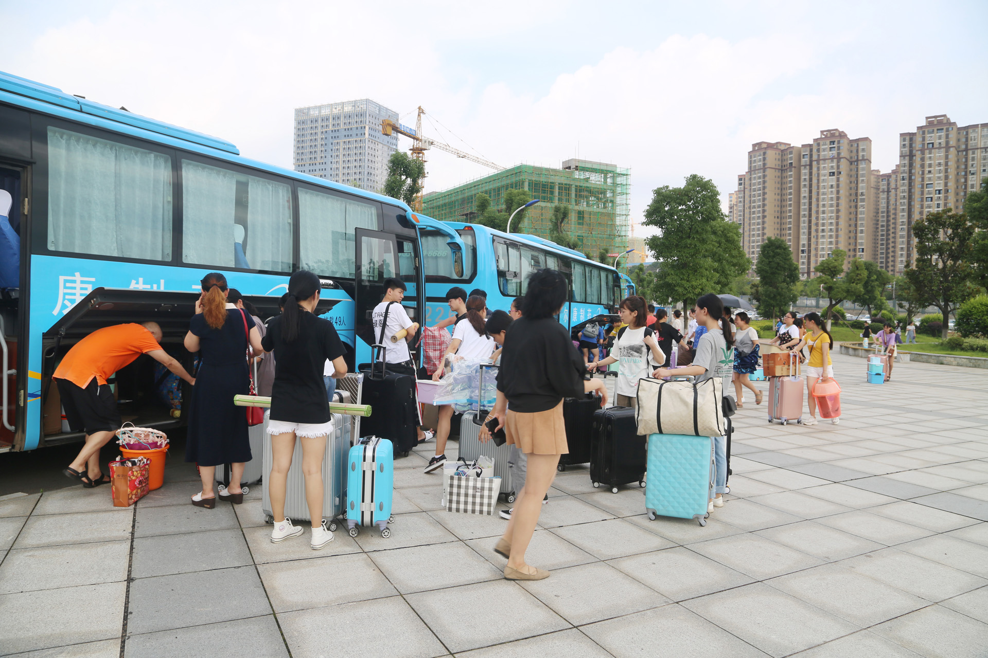 同學們互相幫忙,搬行李、整理行李