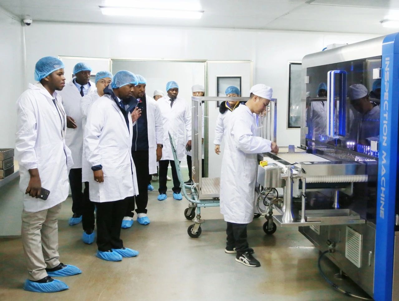 在爾康制藥董事長帥放文的陪同下,坦桑尼亞官員一行參觀了公司的成品藥制劑車間。現(xiàn)代化生產(chǎn)設(shè)備和自動(dòng)化生產(chǎn)流程給他們留下了深刻印象,他們對(duì)爾康制藥在藥品生產(chǎn)、質(zhì)量控制以及包裝流程等方面的嚴(yán)格標(biāo)準(zhǔn)和先進(jìn)技術(shù)表示高度贊賞。